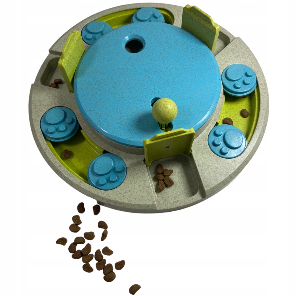 Karmę lub smakołyki wsypujemy do górnych otworów – pupil manipulując kapslami i pokrywkami uwalnia przekąski z kanałów i dopiero wtedy może je zjeść.   Układanka dla psa, dzięki której Twój pupil rozwija zmysły oraz uczy się skupienia i cierpliwości. Pomaga utrzymać aktywność ciała i umysłu.