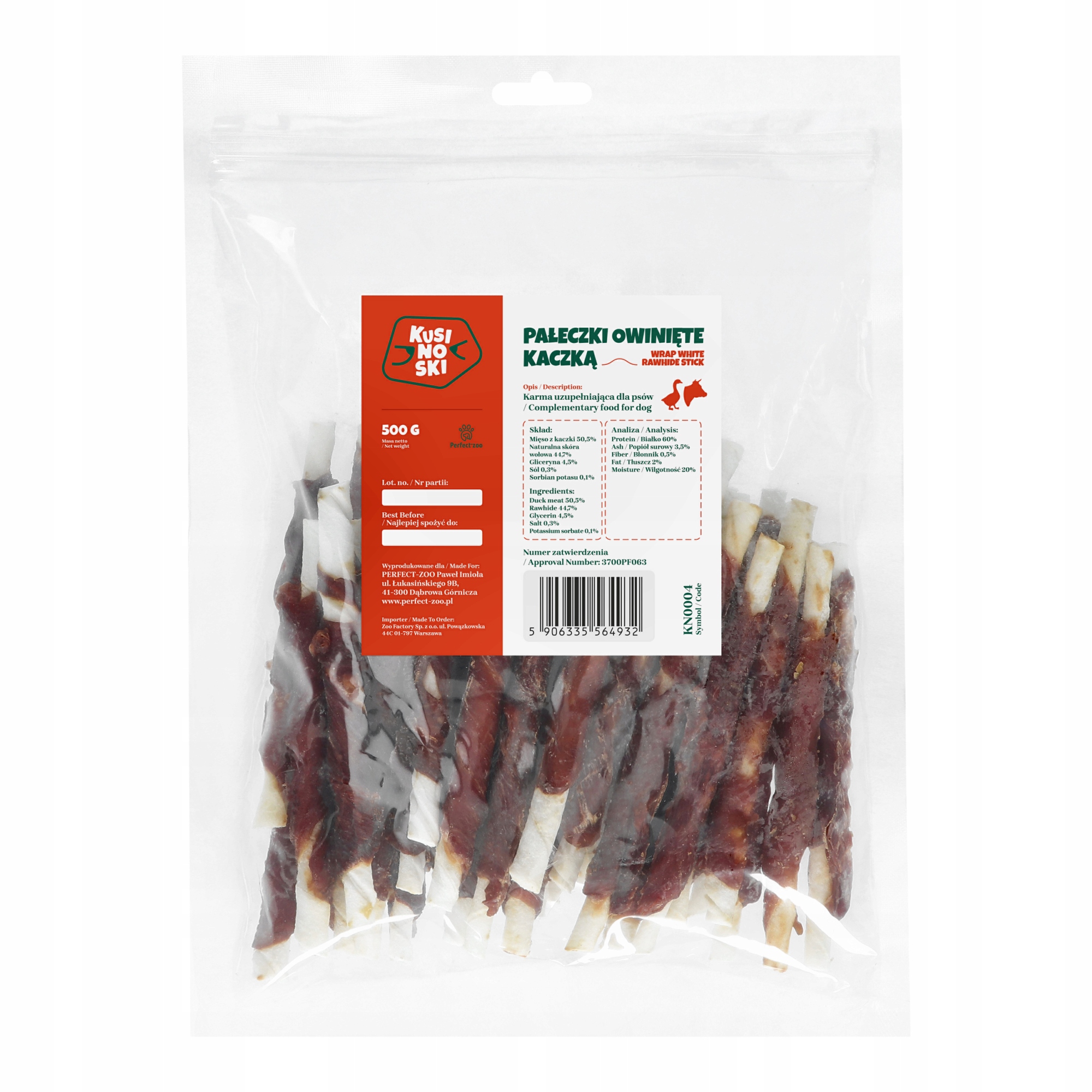 Oferujemy bardzo wyjątkowy produkt – Kusinoski Pałeczki owinięte kaczką o wadze 500g, który nie zawiera żadnych sztucznych dodatków chemicznych, gwarantując 100% naturalność.