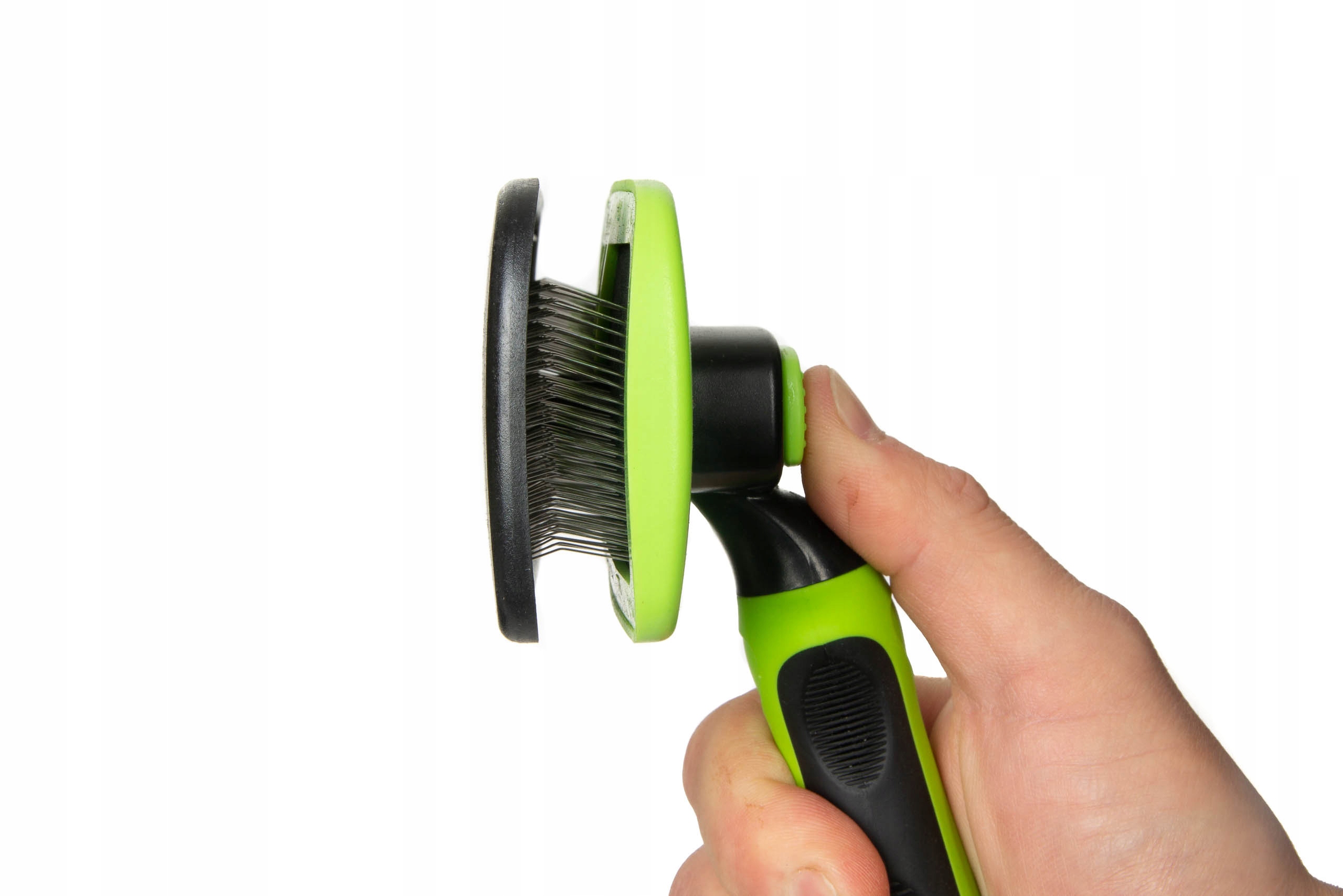 Delikatne szpilki wyczesują martwy włos i podszerstek, oczyszczając sierść z zanieczyszczeń i nadając jej połysk. Specjalny system ułatwia usuwanie wyczesanej sierści ze szczotki.